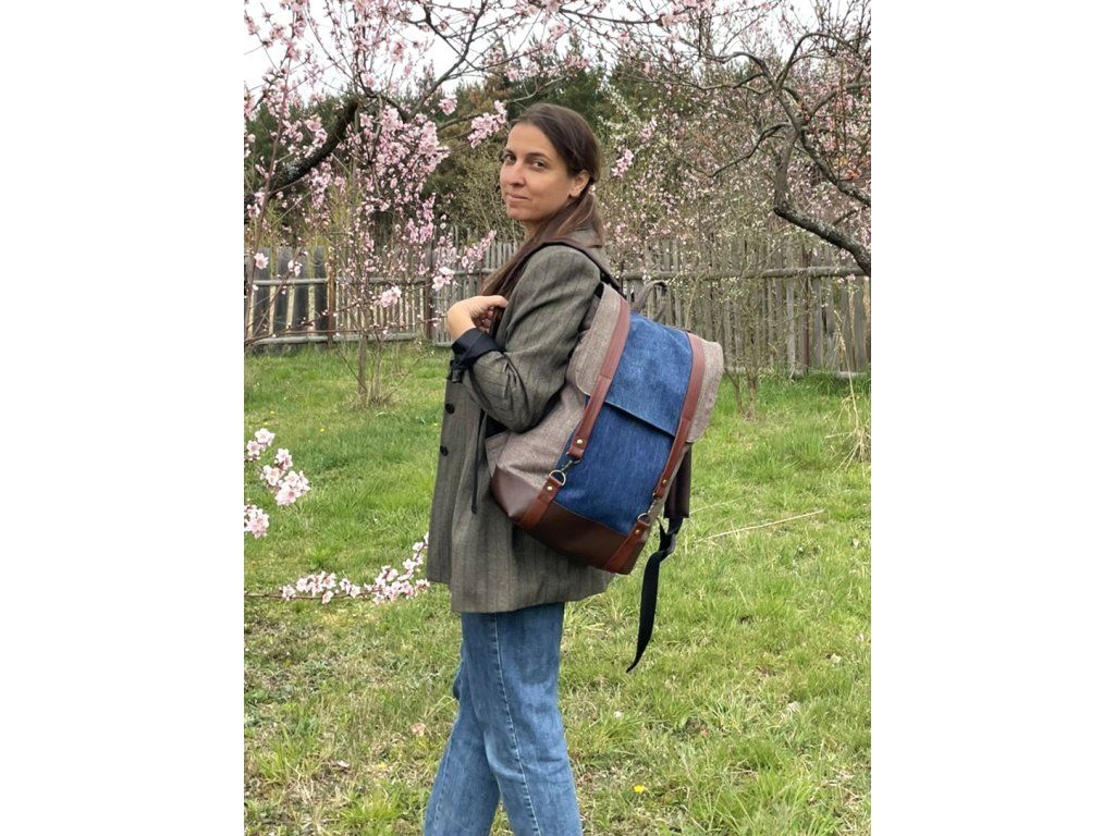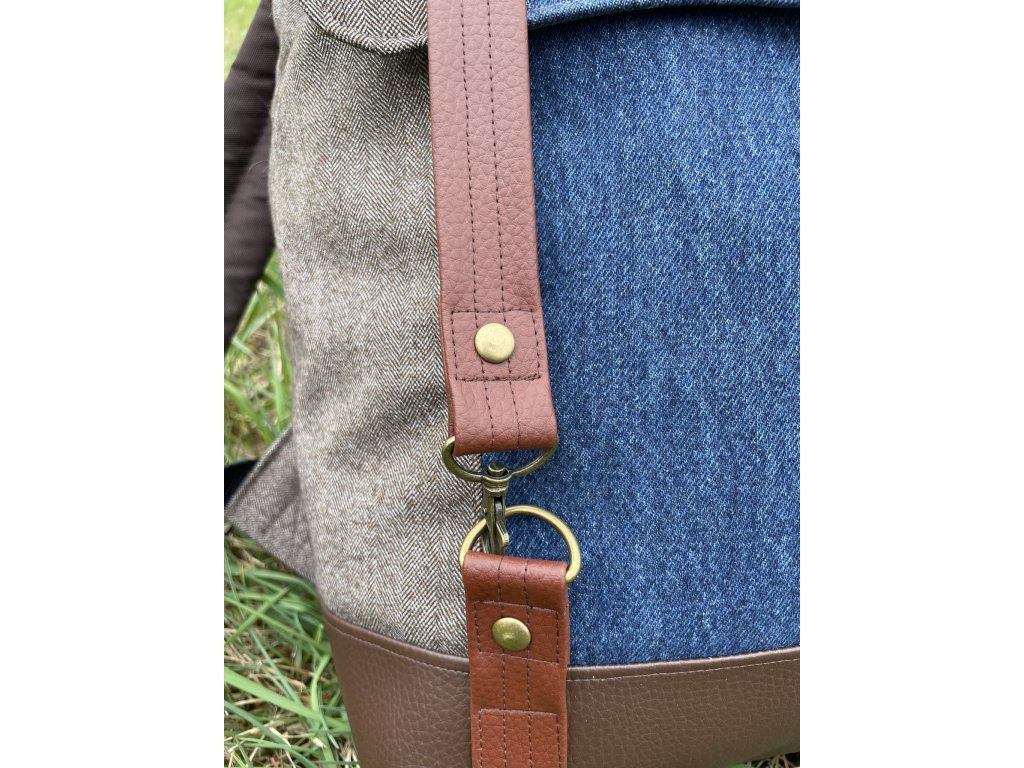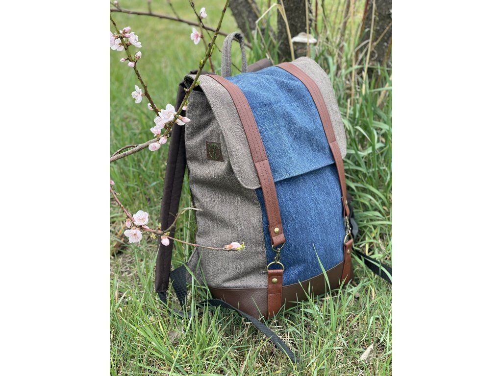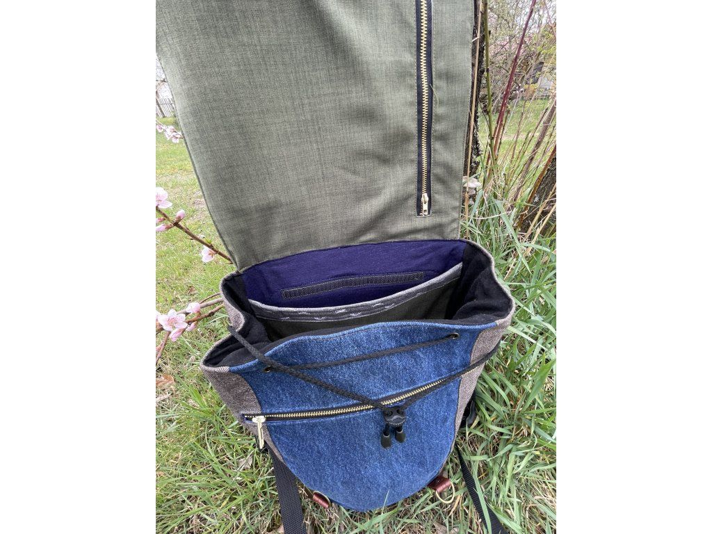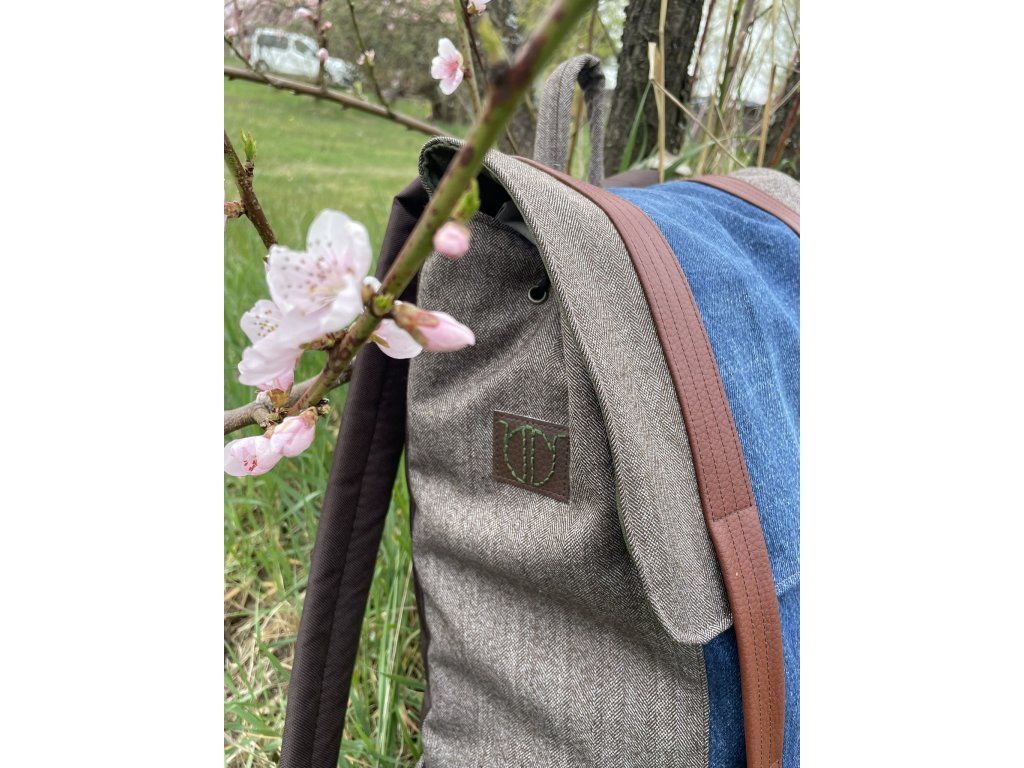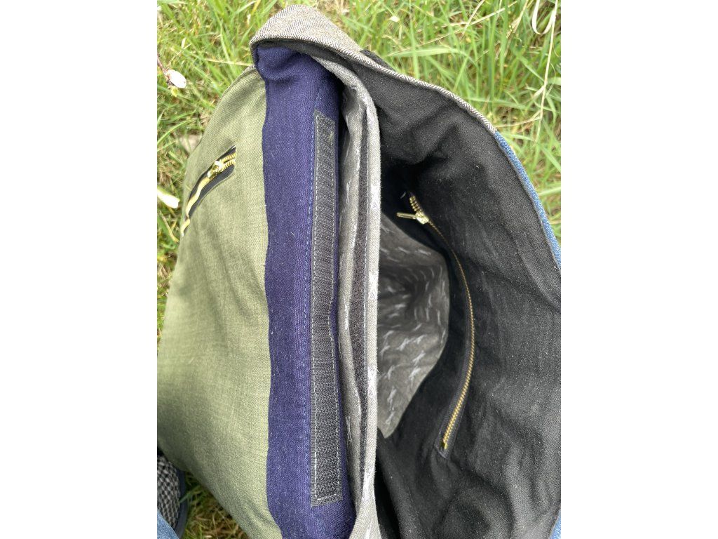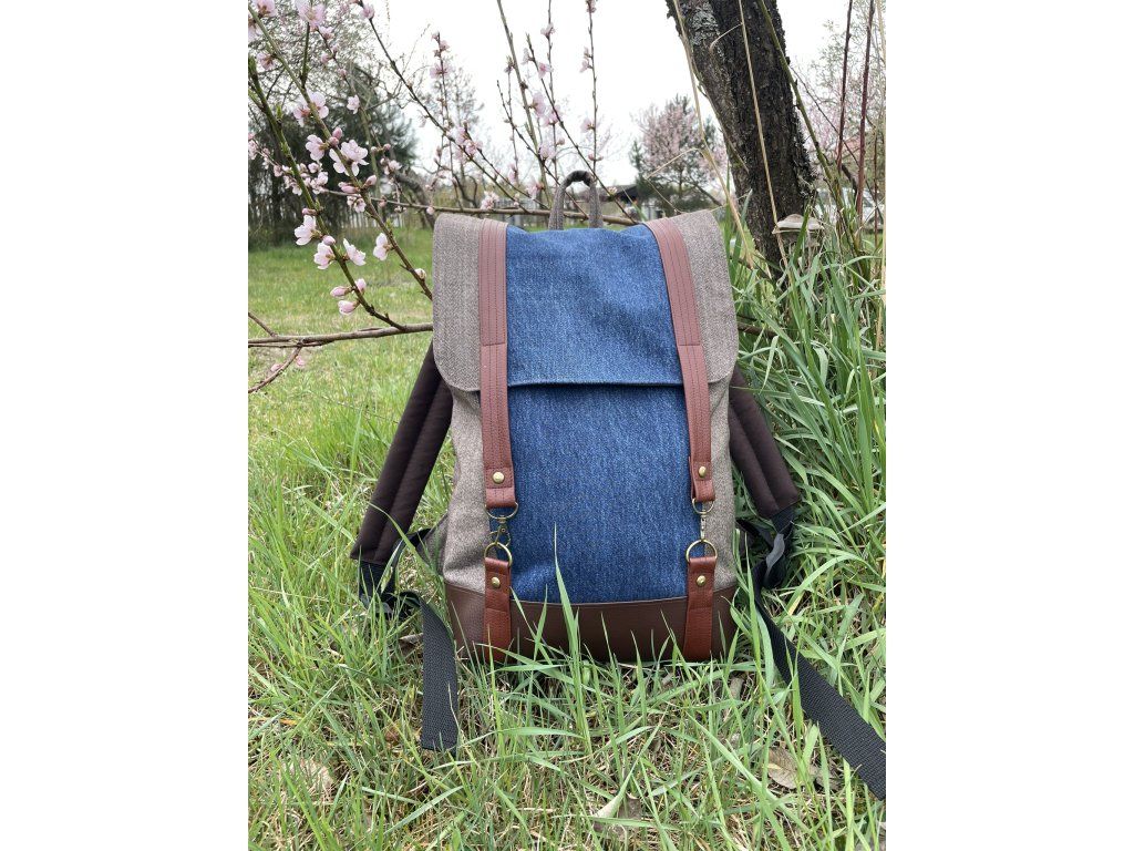 Veškeré části batohu jsou ušity buďto ze zbytků nepromokavé kočárkoviny, nebo jsou z kousků zbytkových či upcyklovaných látek a rovněž podloženy nepromokavou kočárkovinou, takže neproprší. Spodek batohu je vyztužen odolnou čalounickou koženkou.