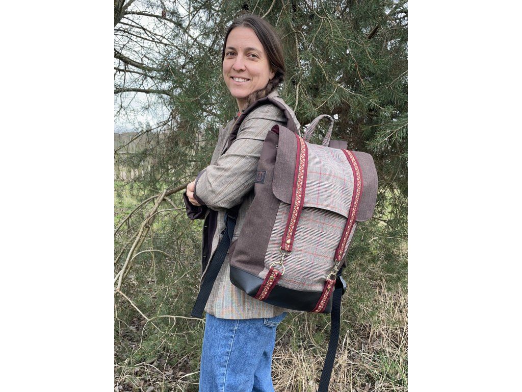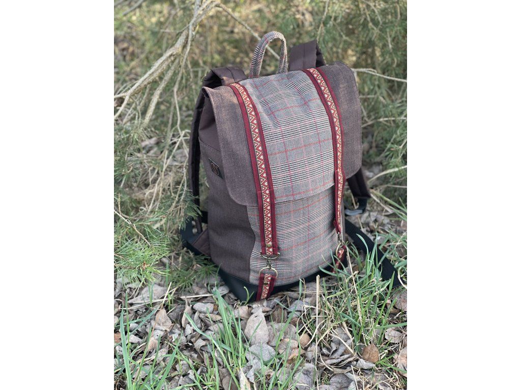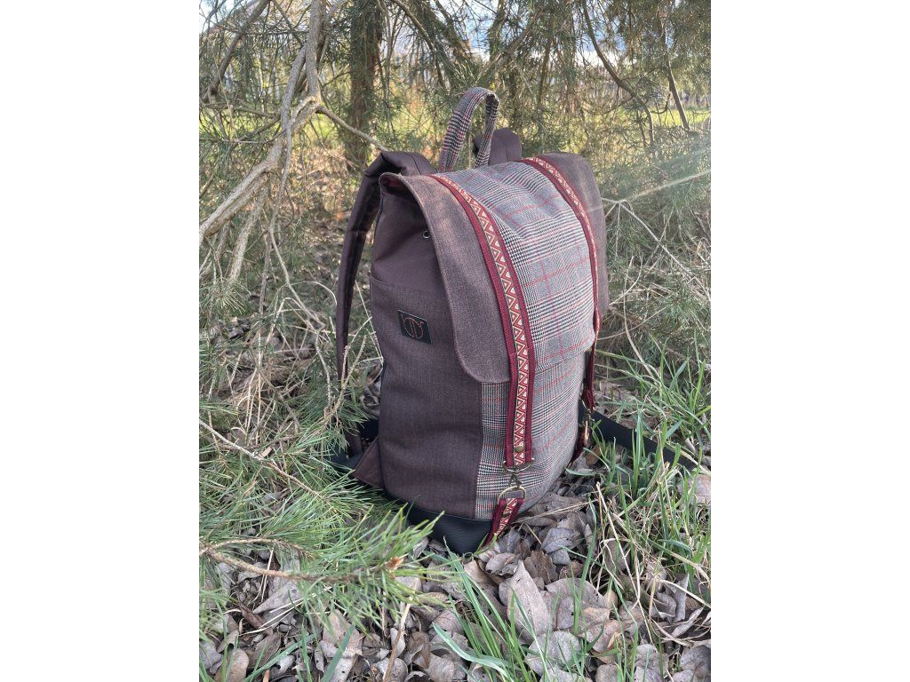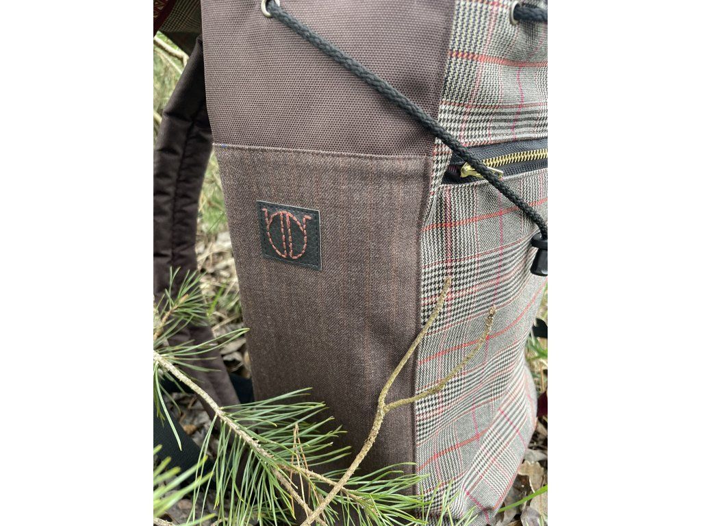 Částečně upcyklovaný batoh od Chrobáků o objemu 14 litrů je vyroben z dámské sukně s jemným kostkovým vzorem a jednoho starého sáčka v hnědé barvě s jemným proužkem. Podšívku jsem vykutila z upcyklovaných pánských košil, takový lehce bláznivý mix. Zádové popruhy a zadní část batohu jsou z hnědé a černé kočárkoviny.