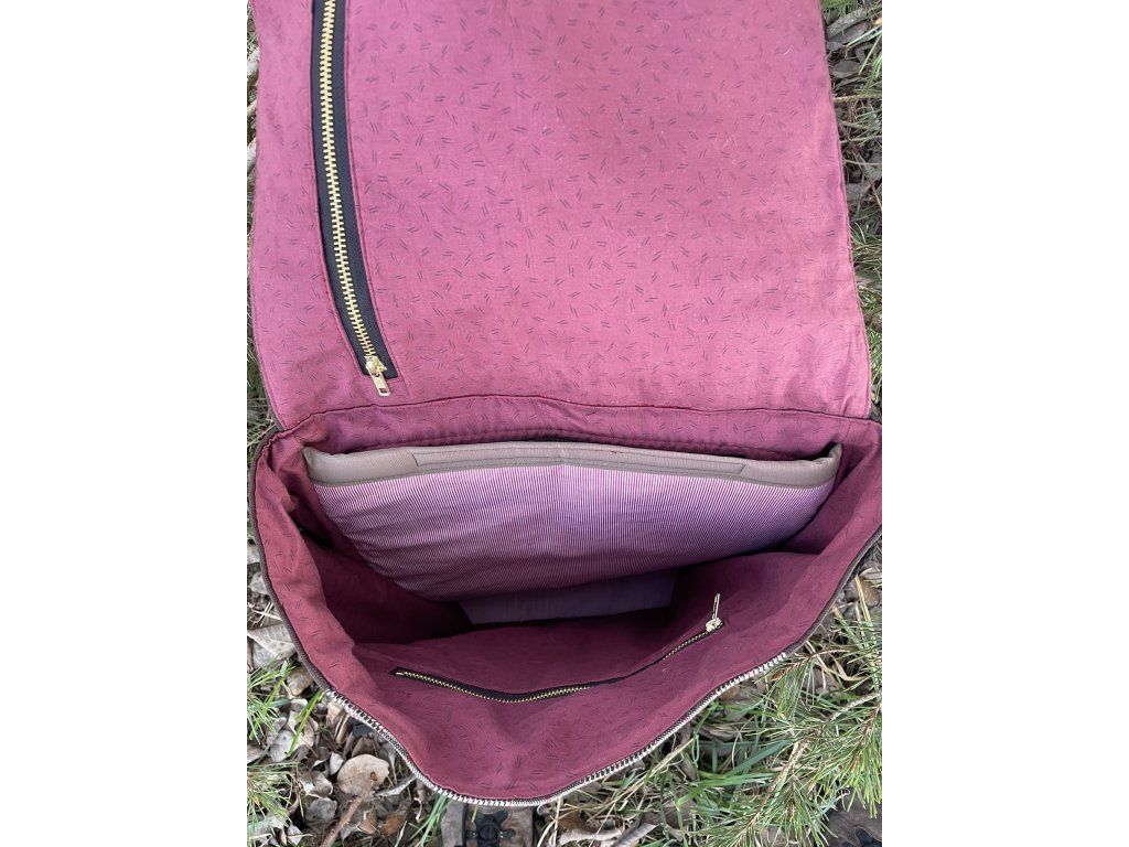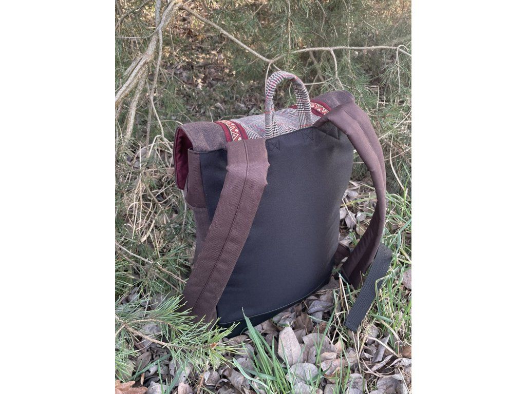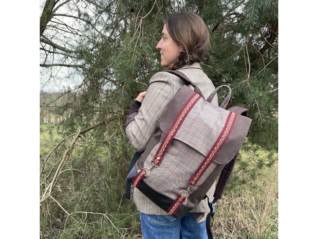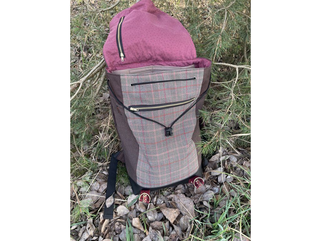 Částečně upcyklovaný batoh od Chrobáků o objemu 14 litrů je vyroben z dámské sukně s jemným kostkovým vzorem a jednoho starého sáčka v hnědé barvě s jemným proužkem. Podšívku jsem vykutila z upcyklovaných pánských košil, takový lehce bláznivý mix. Zádové popruhy a zadní část batohu jsou z hnědé a černé kočárkoviny.