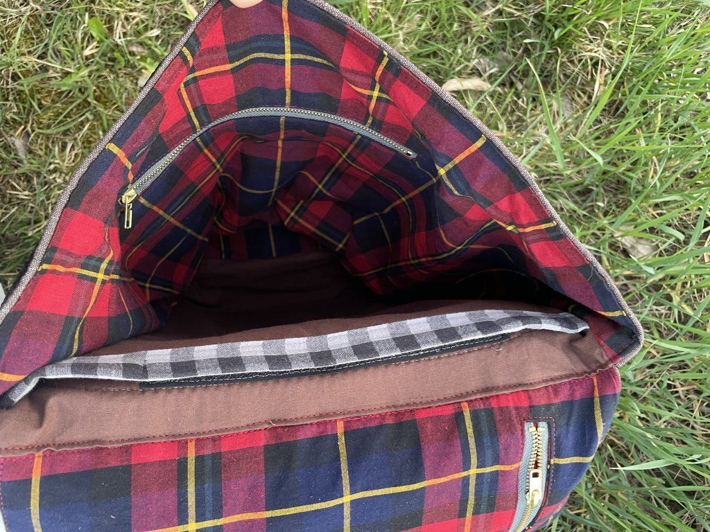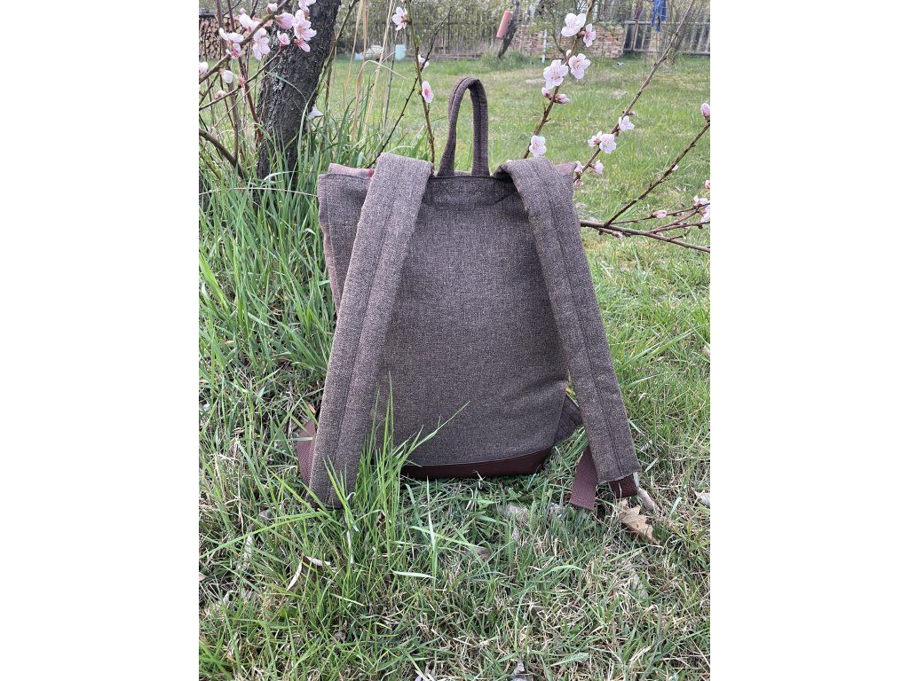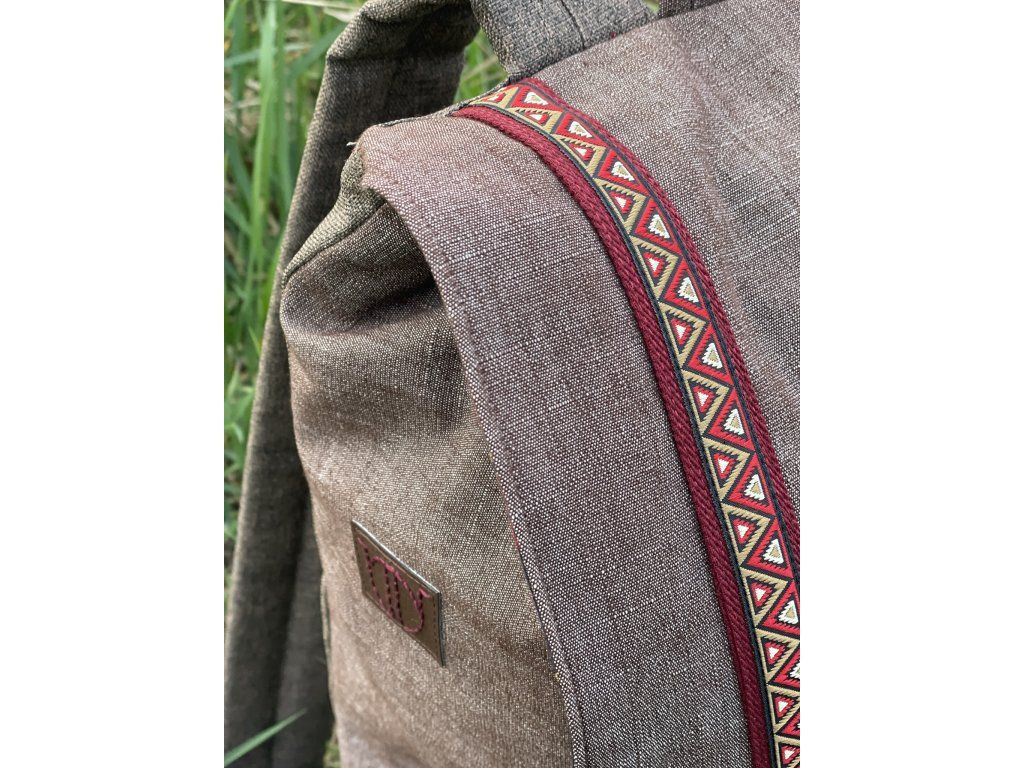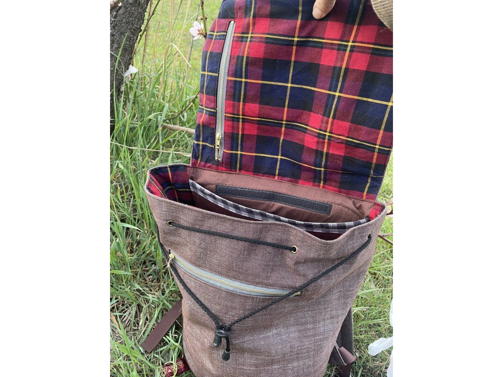 Veškeré části batohu jsou ušity buďto ze zbytků nepromokavé kočárkoviny, nebo jsou z kousků zbytkových či upcyklovaných látek a rovněž podloženy nepromokavou kočárkovinou, takže neproprší. Spodek batohu je vyztužen odolnou čalounickou koženkou.