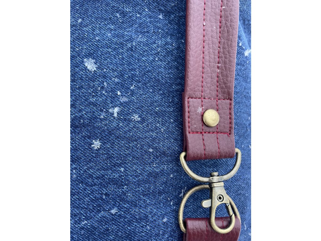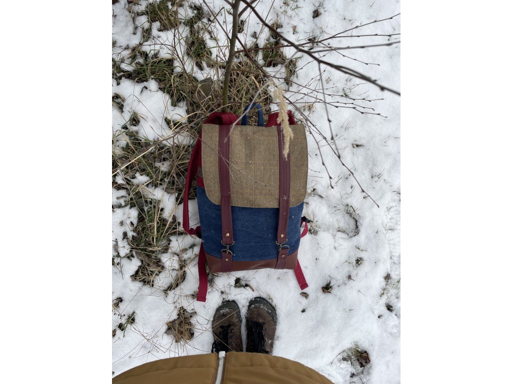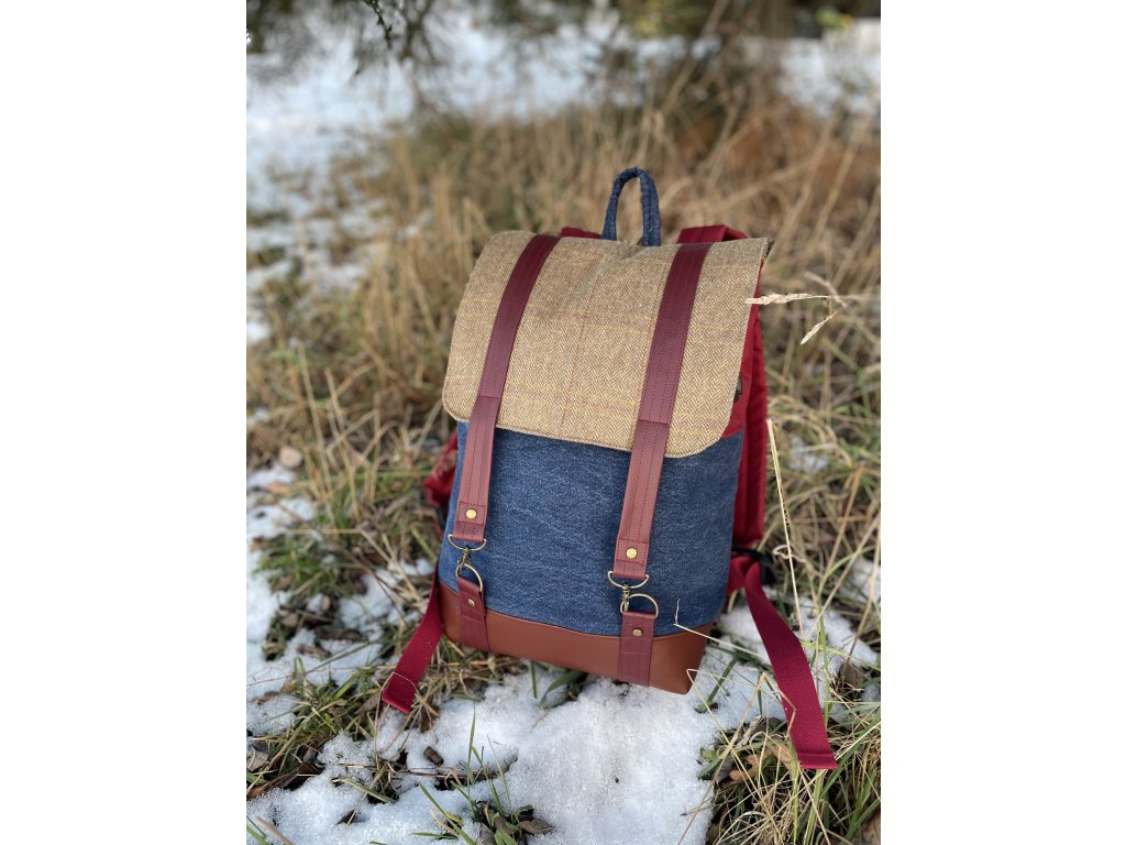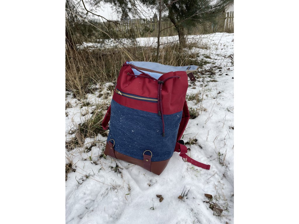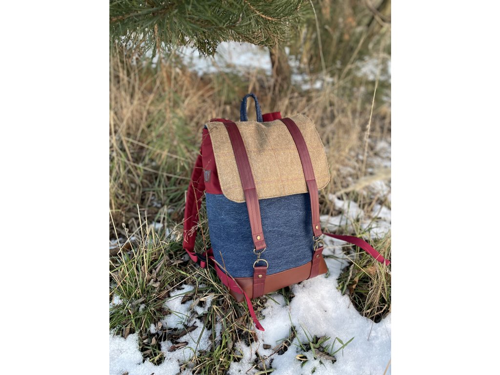 Upcyklovaný batoh od Chrobáků o objemu 14 litrů je vyroben z upcyklované džínoviny, zbytků pískového sáčka a doplněný o bordó kočárkovinu. Podšívku jsem vykutila z jedné košile a zbytků bavlněných látek, takový lehce bláznivý mix.