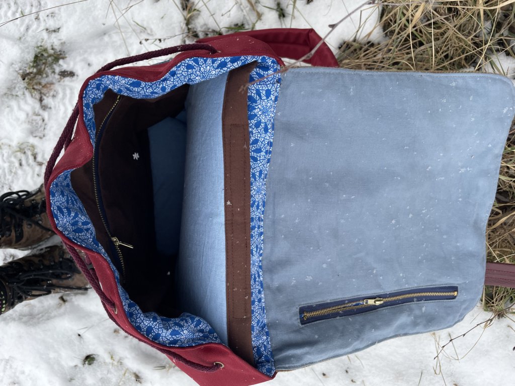Veškeré části batohu jsou ušity buďto ze zbytků nepromokavé kočárkoviny, nebo jsou z kousků zbytkových či upcyklovaných látek a rovněž podloženy nepromokavou kočárkovinou, takže neproprší. Spodek batohu je vyztužen odolnou čalounickou koženkou, která zároveň slouží jako prevence zašpinění textilních částí při položení na zem. Stejně tak popruhy na víku jsou koženkovéa opatřeny kovovými karabinami.
