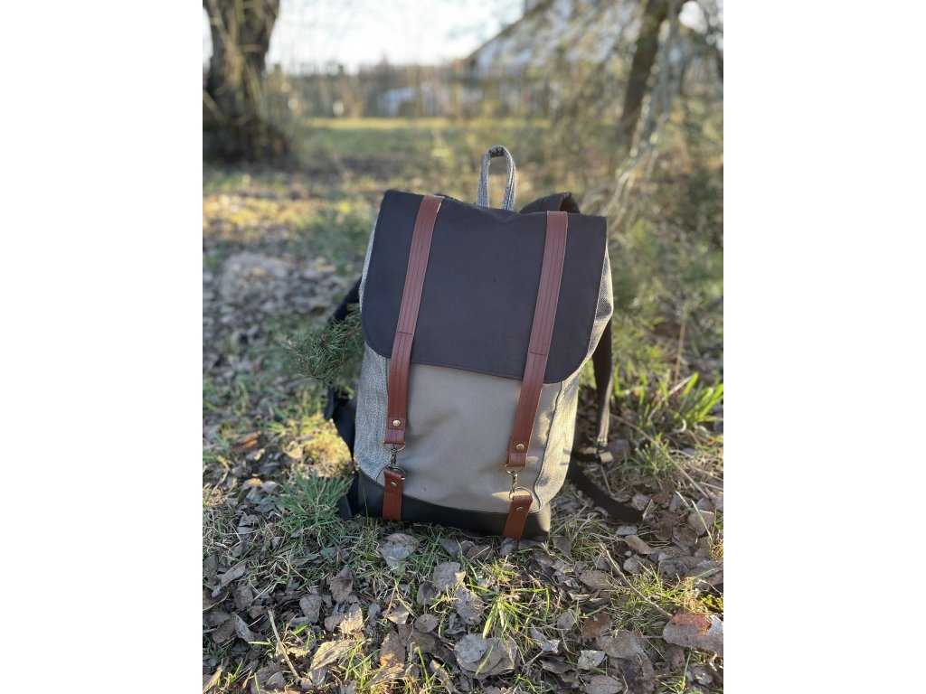 Veškeré části batohu jsou ušity buďto ze zbytků nepromokavé kočárkoviny, nebo jsou z kousků zbytkových či upcyklovaných látek a rovněž podloženy nepromokavou kočárkovinou, takže neproprší. Spodek batohu je vyztužen odolnou čalounickou koženkou v rezavě hnědém odstínu, která zároveň slouží jako prevence zašpinění textilních částí při položení na zem. Stejně tak popruhy na víku jsou koženkovéa opatřeny kovovými karabinami.