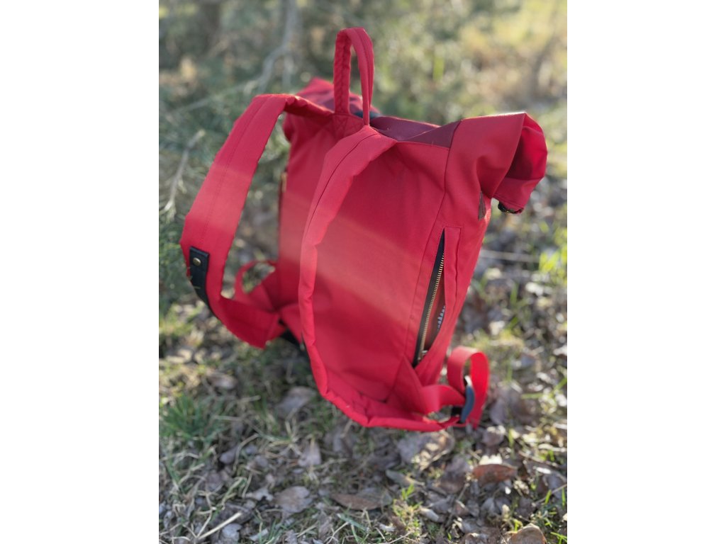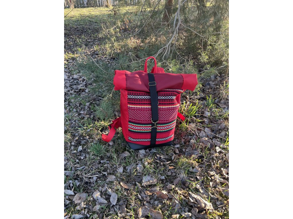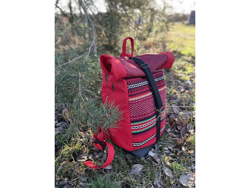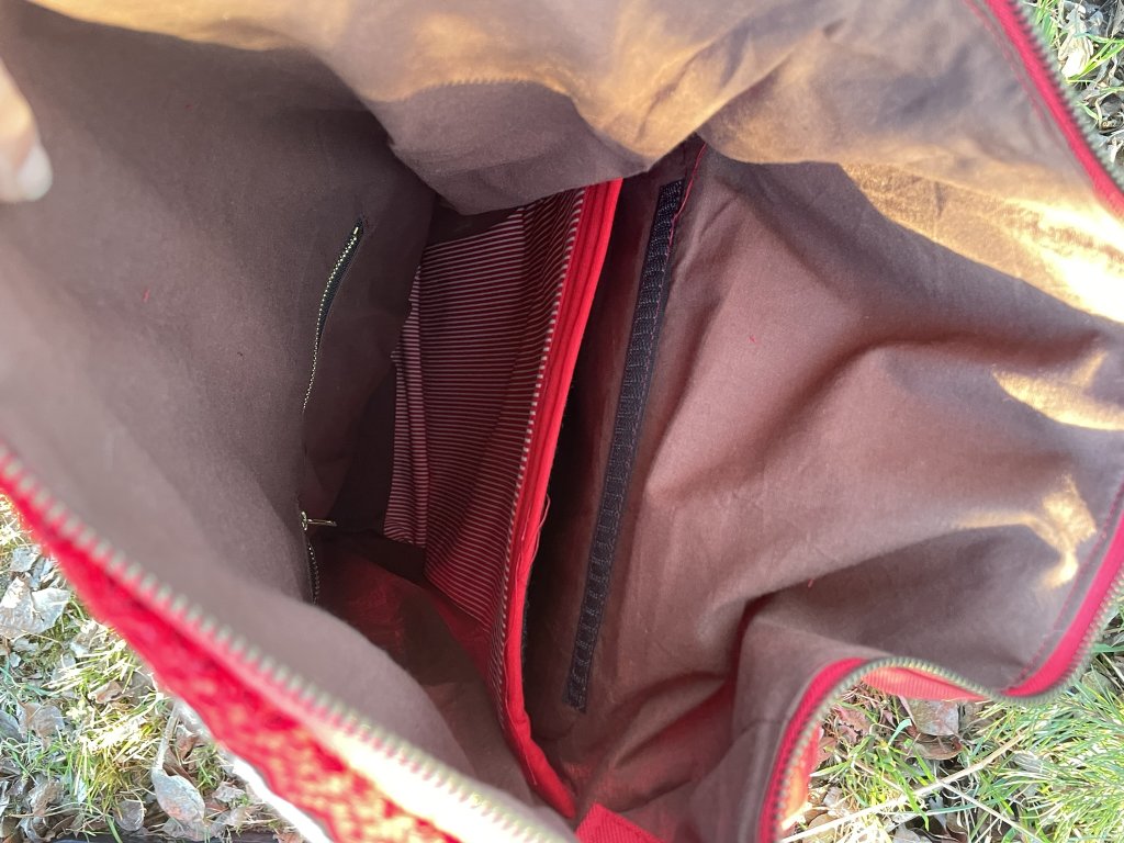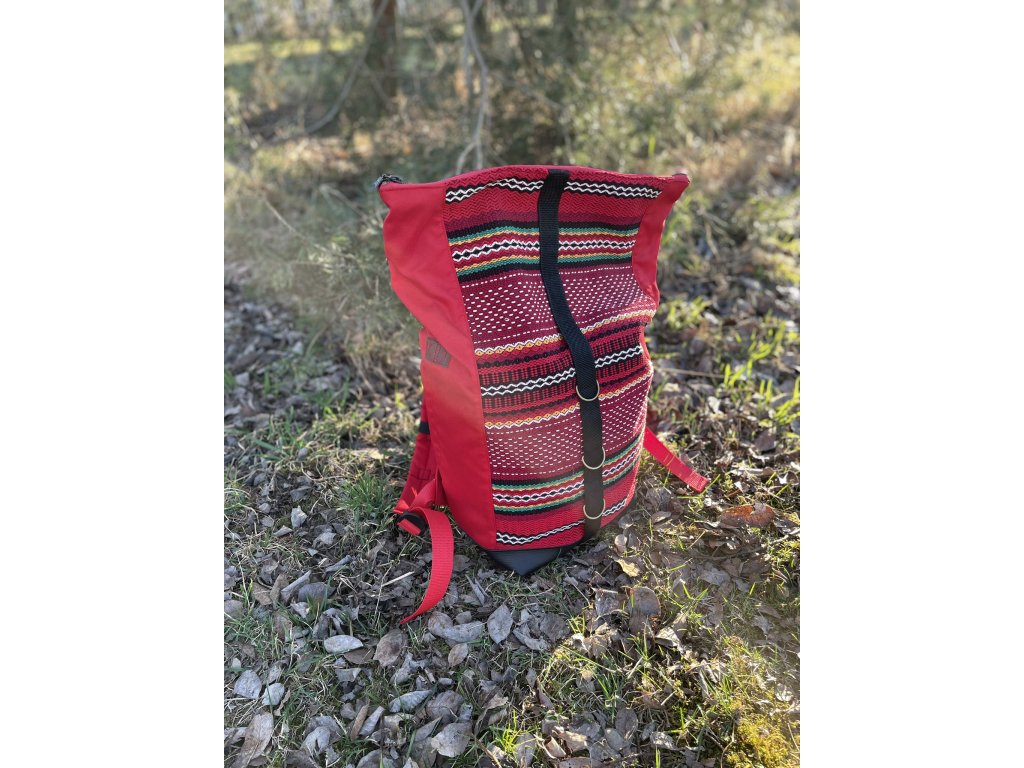 Částečně upcyklovaný batoh od Chrobáků o objemu 21 litrů je vyroben z krásného tkaného povlaku na dekorační polštář, doplněný o jasně červenou kočárkovinu. Podšívku jsem vykutila z kombinace bavlněných látek, takový lehce bláznivý mix.