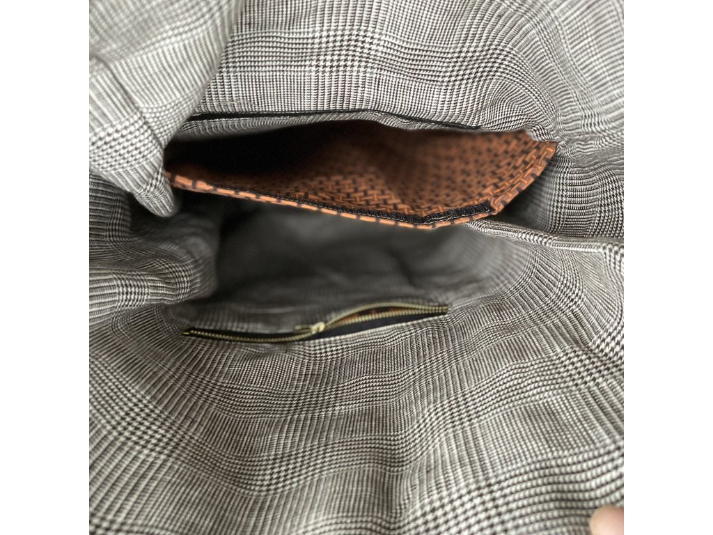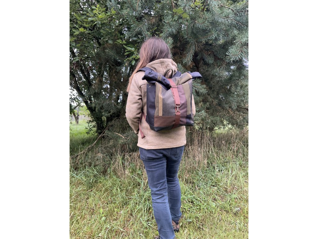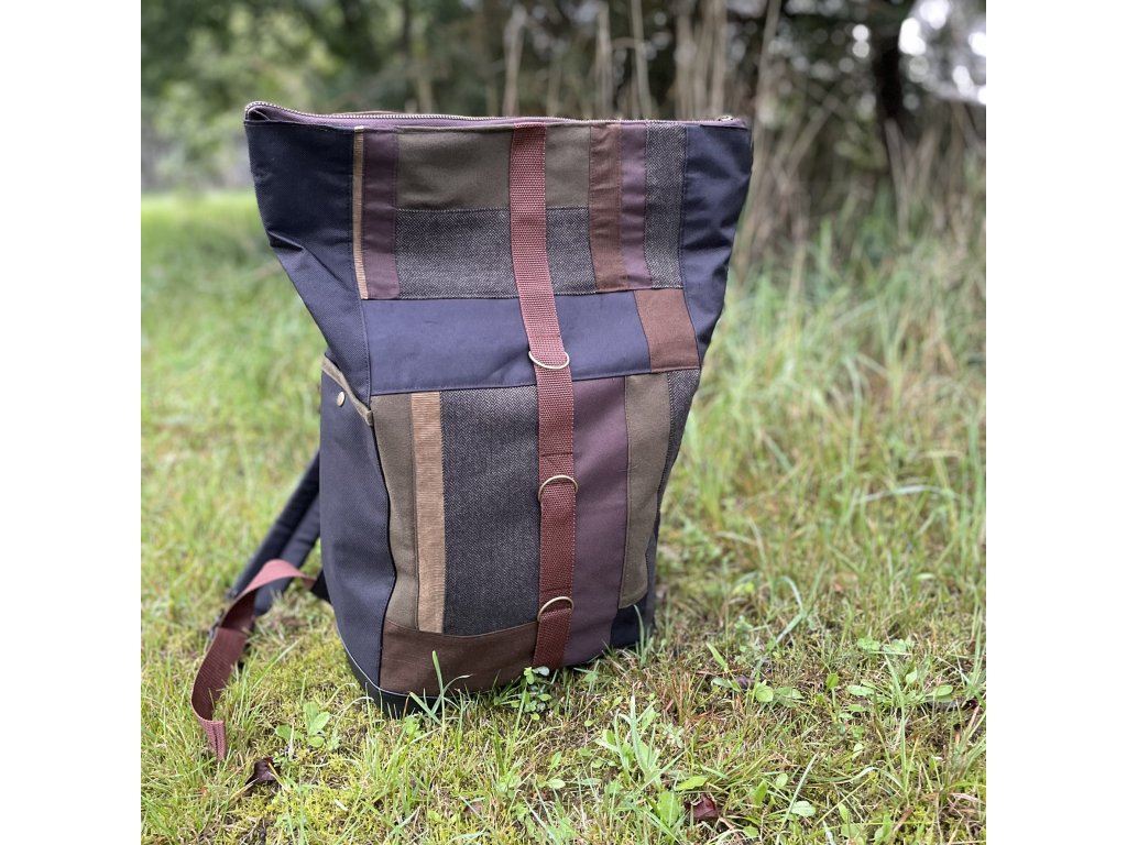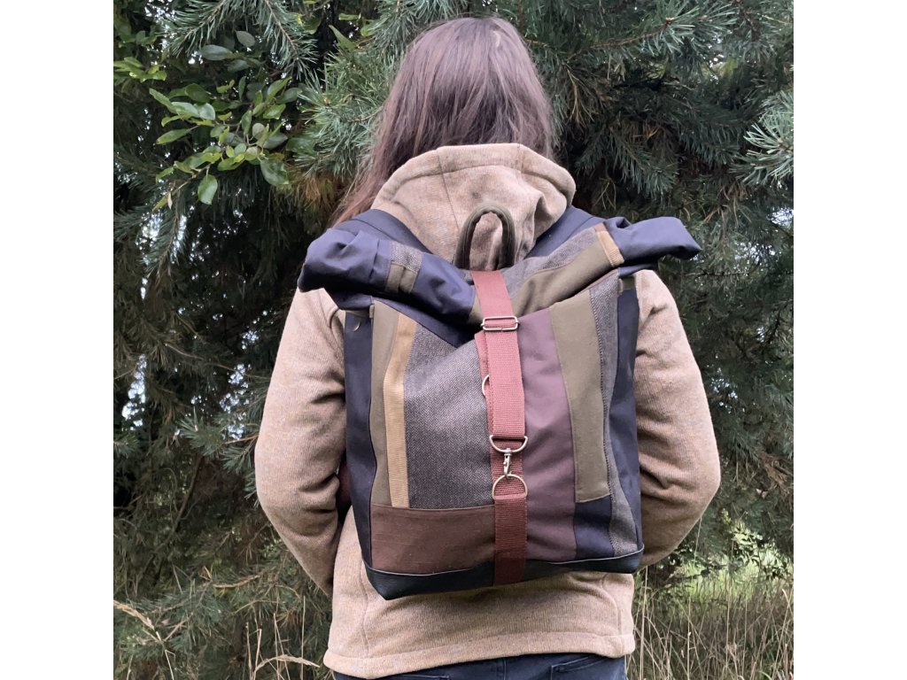 Po letech jsem se vrátila k roll-top střihu batohů.Částečně upcyklovaný, částečně ze zbytků metráže kočárkoviny, batoh od Chrobáků o objemu 14-21l je vyroben z odstřižků upcyklovaných obleků doplněných o zbytky černé kočárkoviny.Na podšívku jsem využila bavlněnou košili a další zbytky různých bavlněných látek.