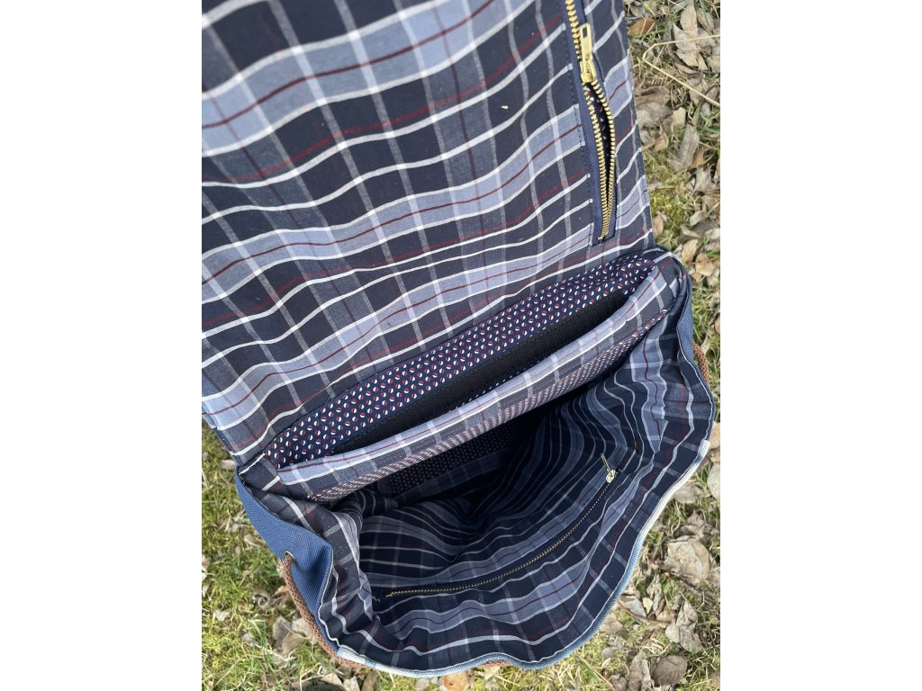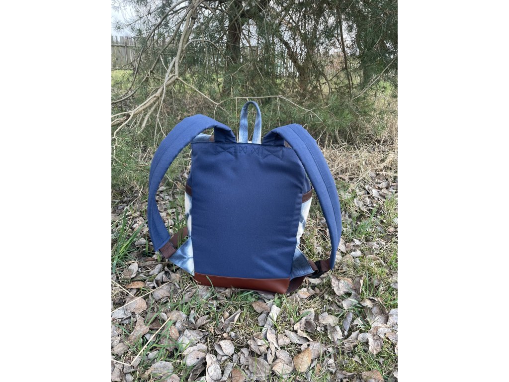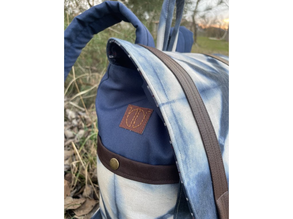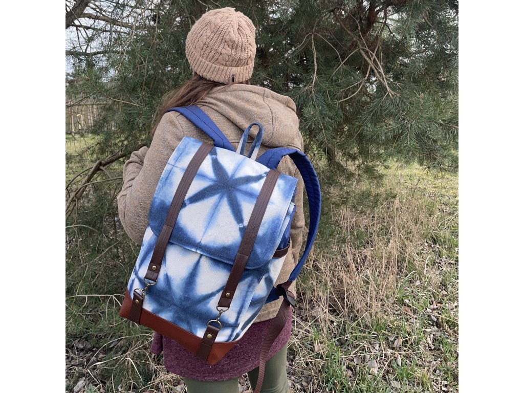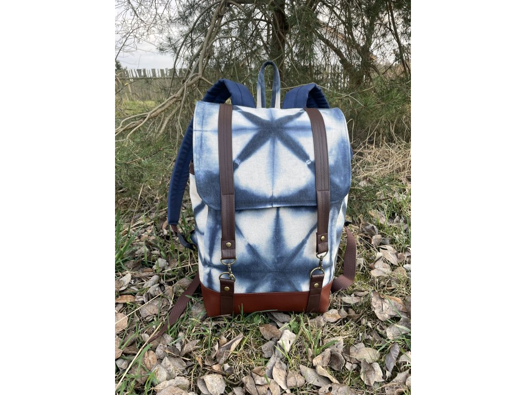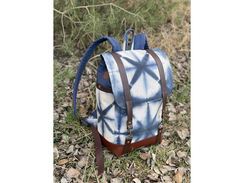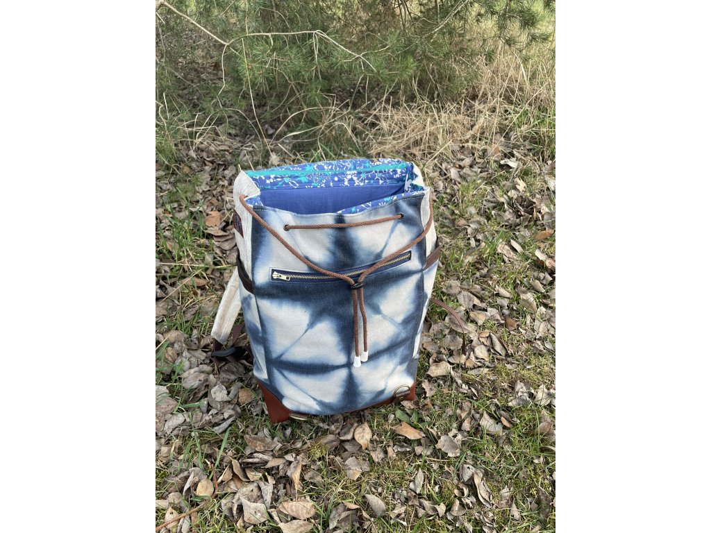 Částečně upcyklovaný batoh od Chrobáků o objemu 19 litrů je  vyroben z autorské tkaniny barvené metodou shibori v  kombinaci s tmavě modrou kočárkovinou. Shibori batika je fixována máčení ve fixačním prostředku a všechny tyto díly jsou pro efekt voděodolnosti podloženy kočárkovinou. Dno batohu a popruhy jsou vyrobeny z kvalitní čalounické koženky v čokoládově hnědém a rezatě hnědém odstínu. Podšívku jsem vykutila z upcyklovaných pánských košil, takový lehce bláznivý mix.