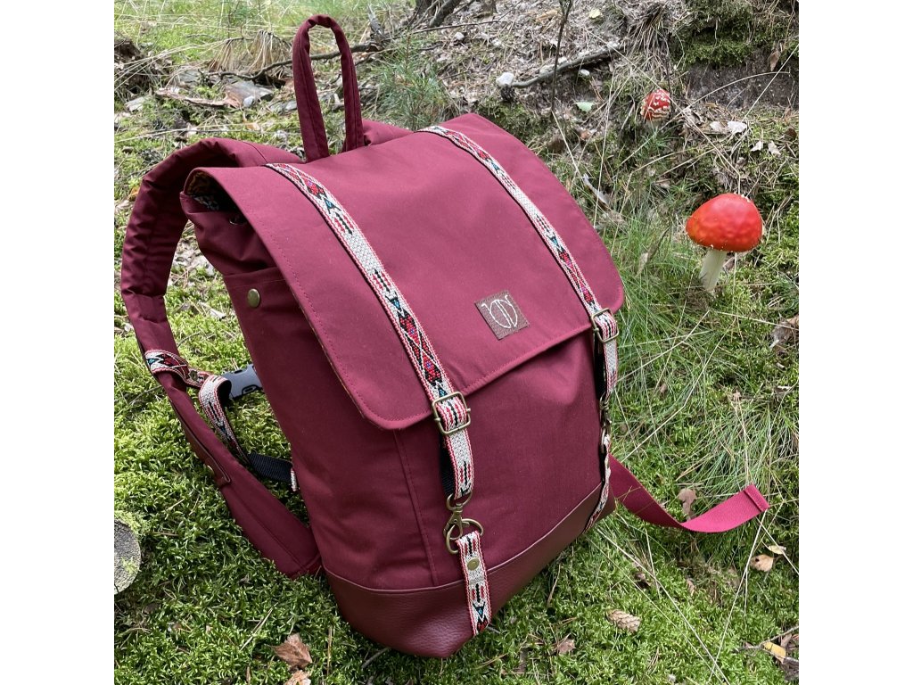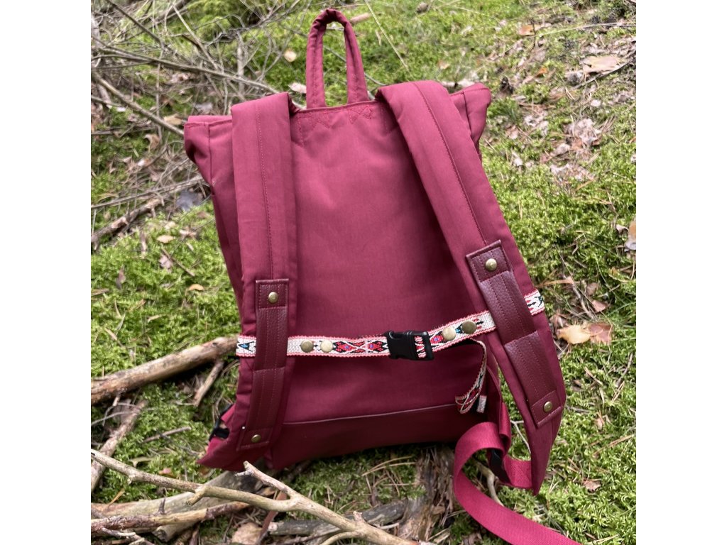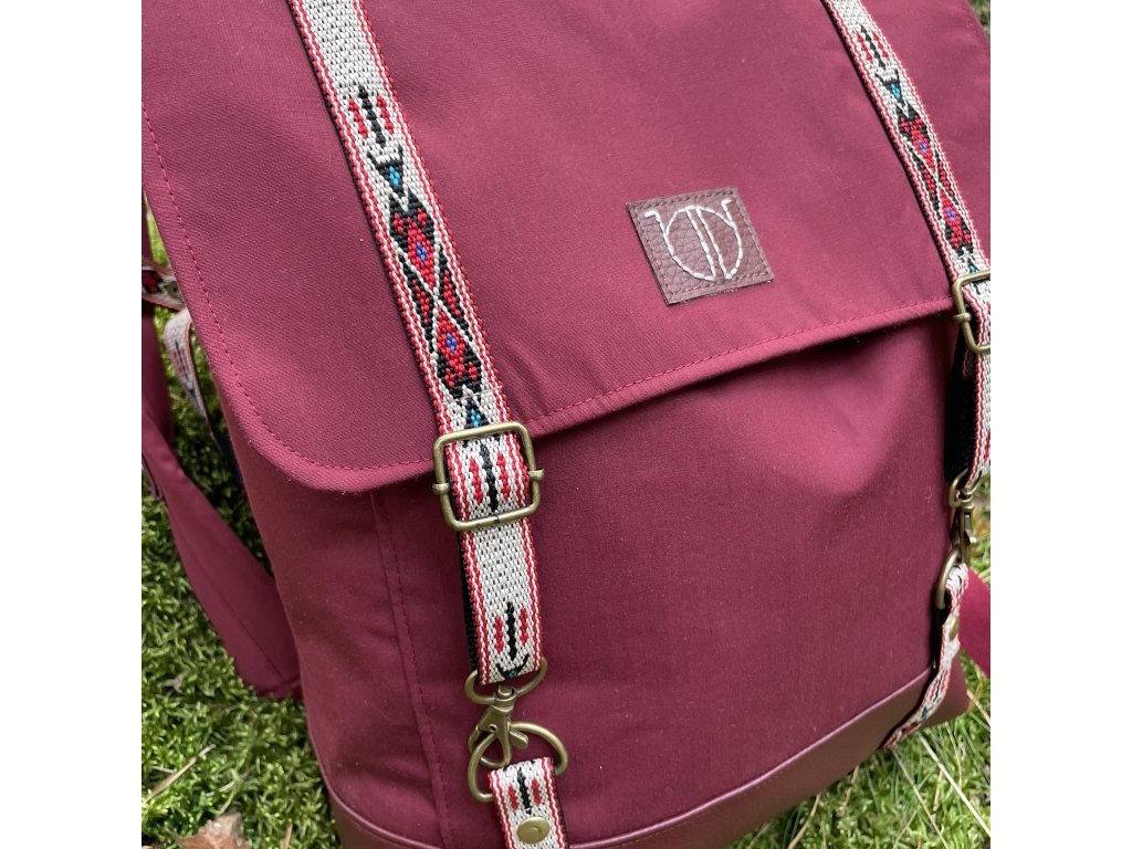 Barevně jednoduchý batoh jsem se rozhodla trochu rozsvítit popruhy s indiánským vzorem. Na víku je lze lehce délkově upravit, což oceníte, když budete potřebovat batůžek pořádně našťouchnout.