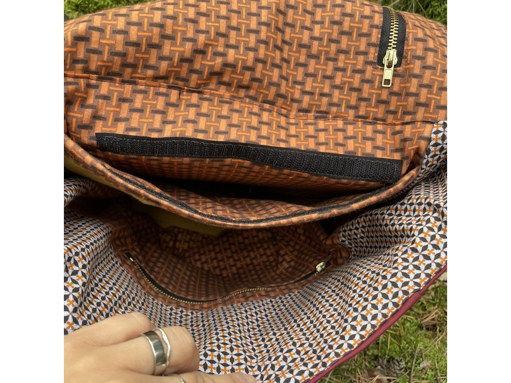 Veškeré části batohu jsou ušity buďto ze zbytků nepromokavé kočárkoviny, nebo jsou z kousků zbytkových či upcyklovaných látek a rovněž podloženy nepromokavou kočárkovinou, takže neproprší. Spodek batohu je vyztužen odolnou čalounickou koženkou, která zároveň slouží jako prevence zašpinění textilních částí při položení na zem.