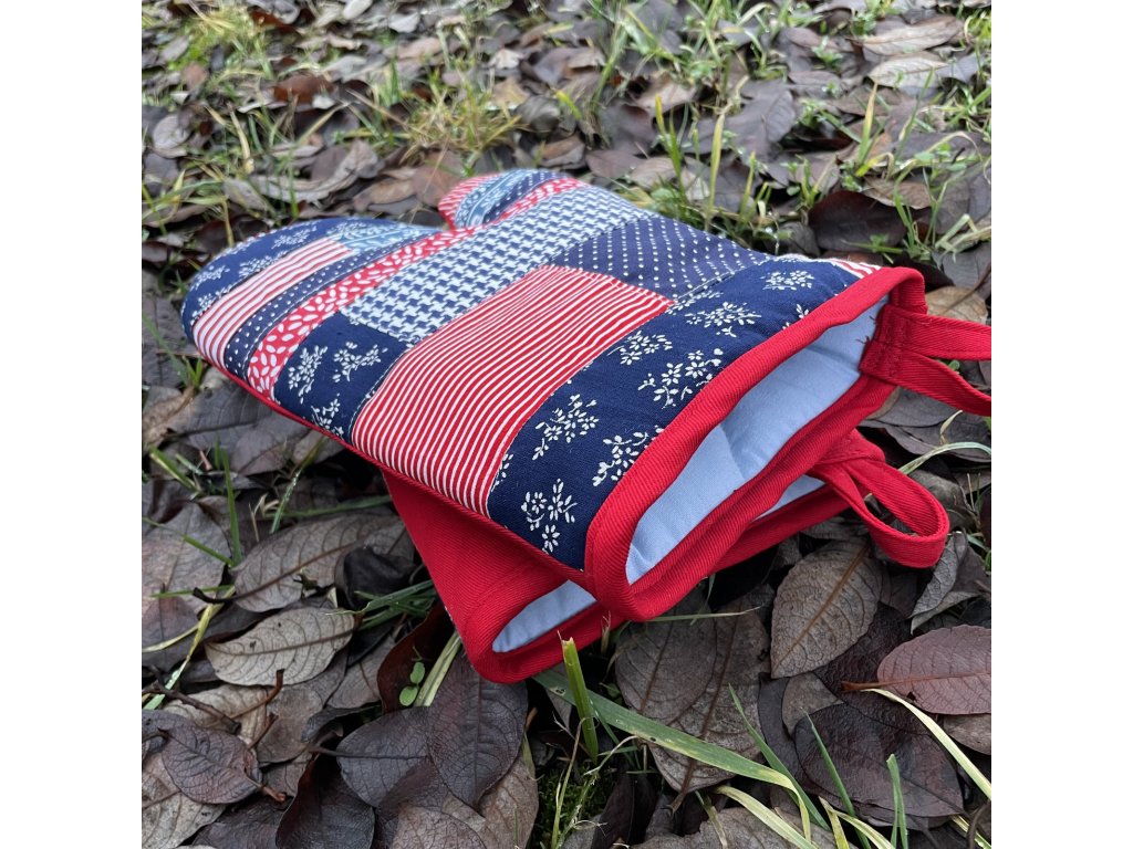 Pár kuchyňských chňapek je ušitý z kombinace odstřižků v červených, modrých a bílých tónech, doplněných jasně červenou keprovinou. Podšívka je vyrobena z upcyklované bavlny. Strana s jednobarevnou keprovinou je vypodložena termolínem s hliníkovou vrstvou, jinak jsou obě strany ještě podloženy velmi silným vatelínem. Chňapky nejen chrání před popálením při čarování v kuchyni či u grilu, zároveň je jde využít (díky jejich buclatosti) jako nouzový polštářek, když vás po kulinaření přepadne náhlá únava.